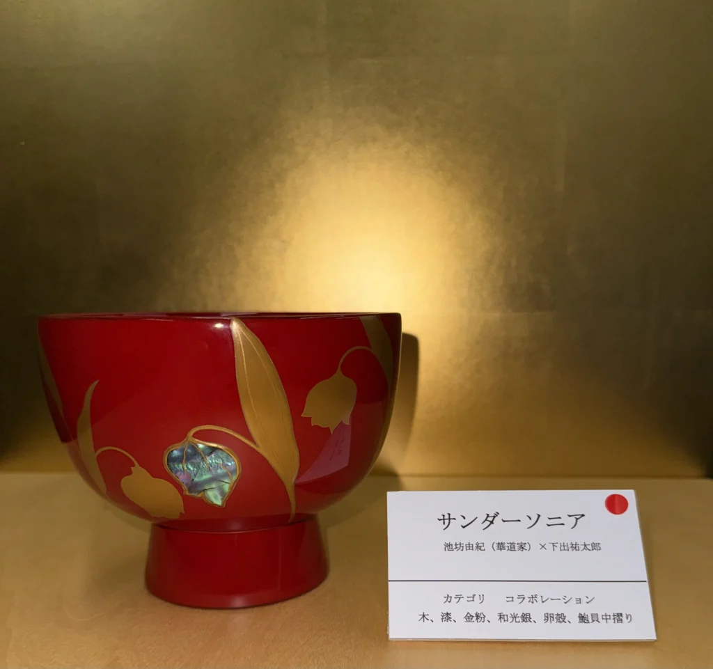 『サンダーソニア』は、近年生け花によく使われる洋花です。お花のふんわりとした可憐な表情が好まれています。華道家元池坊次期家元池坊専好氏がスケッチされたサンダーソニアを合鹿椀に蒔絵で描きました。サンダーソニアの花を鮑貝の螺鈿・鶉の卵殻・金の高蒔絵で表現し、蒔絵の持つ天然素材の魅力を加えました。さらにバックには金蒔絵のシルエットを配してリズム感を出しています。