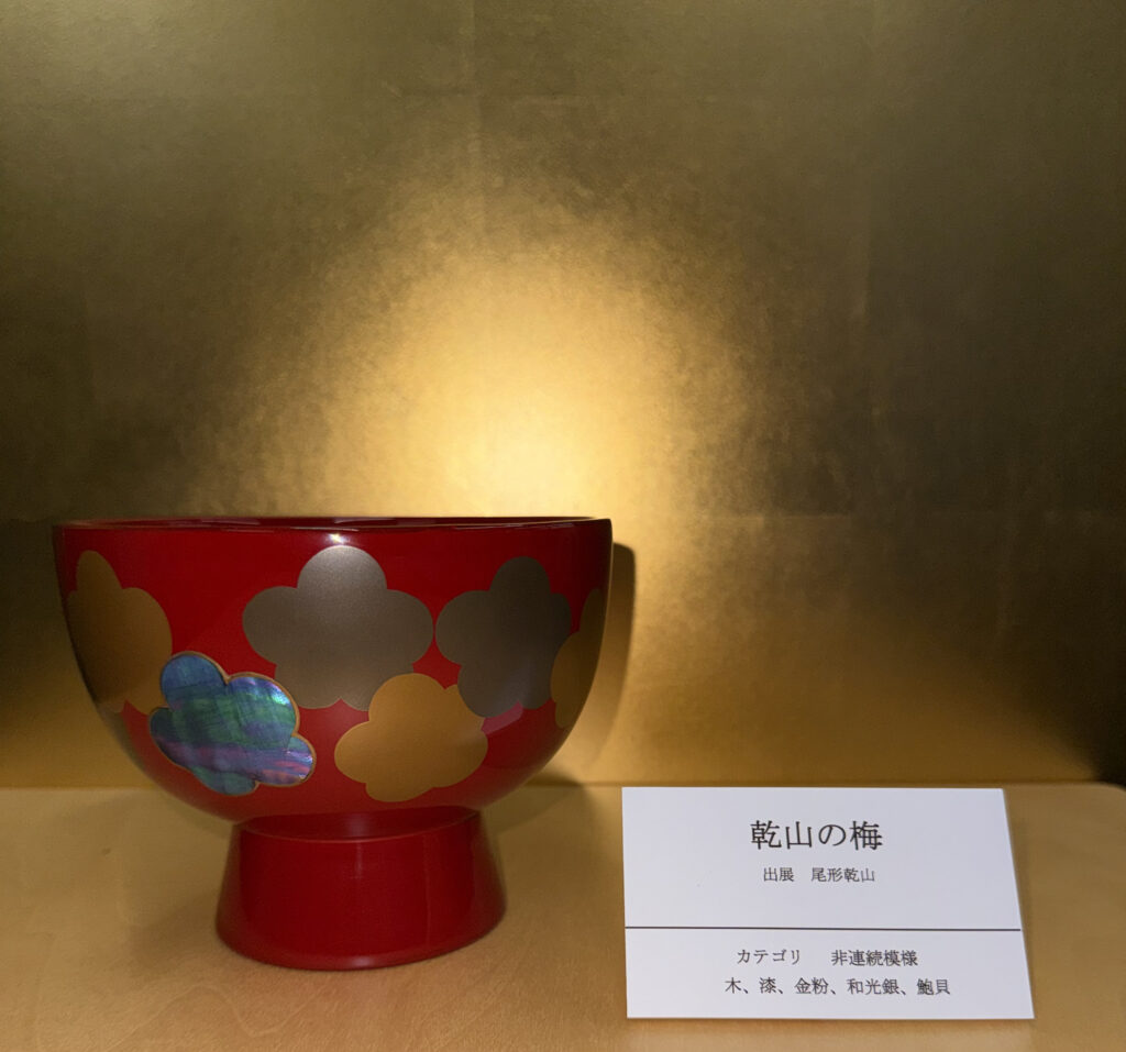 『乾山の梅』は、MIHO MUSEUM蔵の尾形乾山作「銹絵染付梅波文蓋物」の素朴で味わい深い作品を典拠としています。その梅文を、琳派の作品に見受けられる連続模様デザインとして配し、同じ梅模様でありながら寸分違わぬ同じ模様ではない「連続模様」のカテゴリで制作しました。尾形乾山は尾形光琳の弟にあたり江戸中期に活躍した琳派の代表的な作家として知られています。