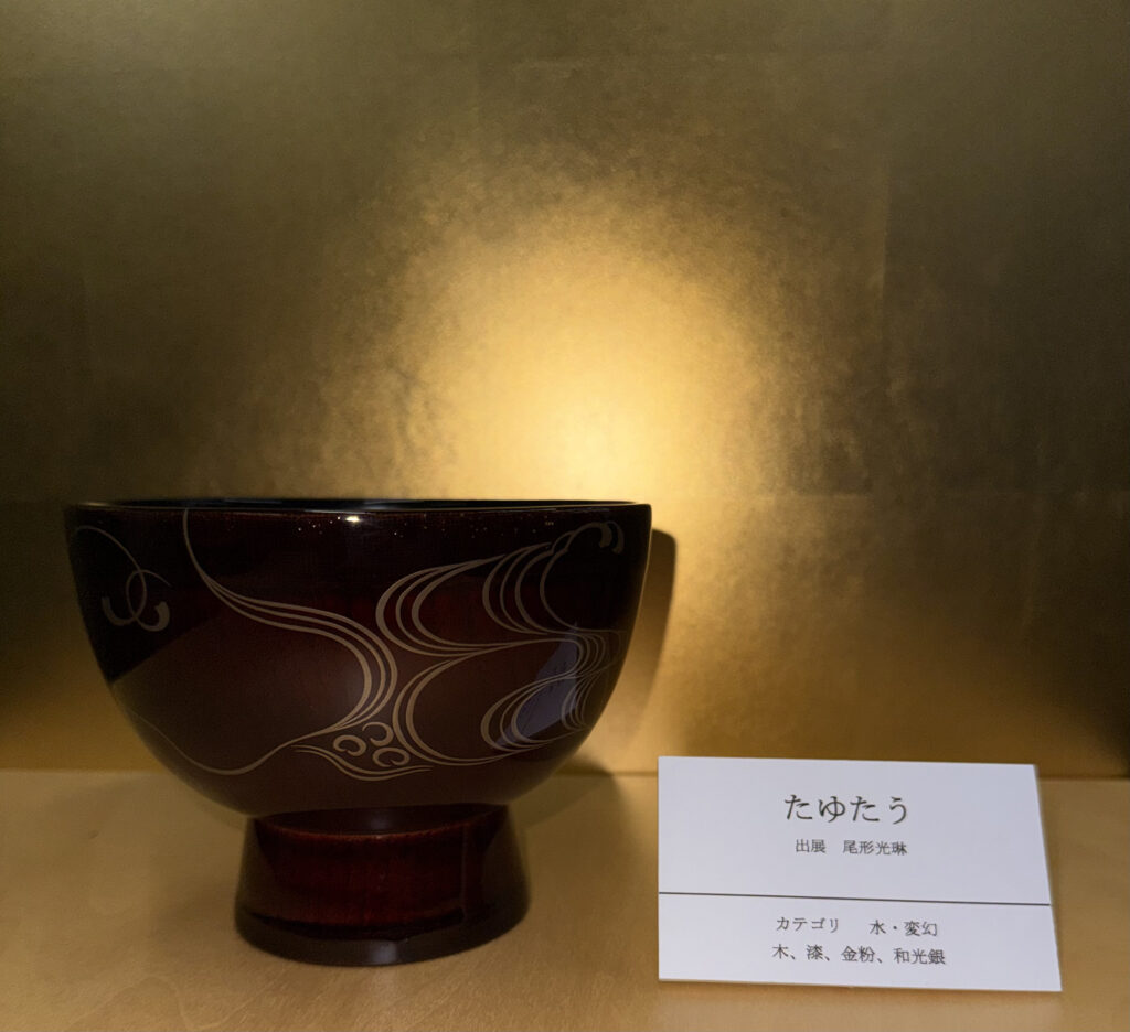 『たゆたう』は、出光美術館蔵の尾形光琳作「蝦蟇図蒔絵硯箱」の下足板の作品部分を典拠としています。さまざまな水の表情を描いてみせた光琳の作品のひとつです。「水」のカテゴリで制作しました。尾形光琳は、特に琳派を代表する作家として知られています。『たゆたう』は、水の表情の中でもゆったりとした風情で、表現の中に何とでも変化するさまが見て取れます。