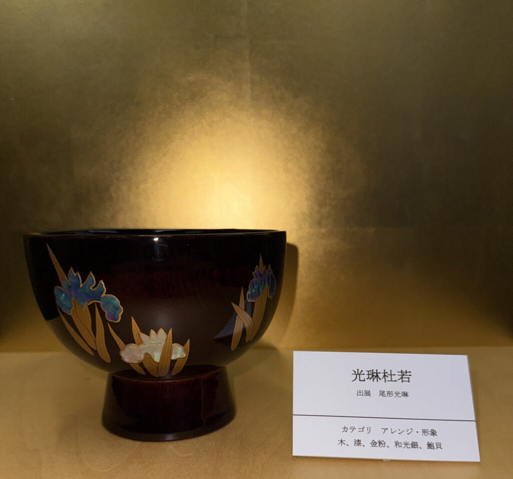 『大杜若』は、大阪市立美術館蔵の、尾形光琳作「燕子花図」の作品を典拠としています。数ある光琳の杜若の絵の中で花のみに焦点をあてて作品化をしました。「ディティール」のカテゴリで制作しました。杜若の花を螺鈿と鶉の卵殻、葉を金の平蒔絵でリズム感を持って描きました。尾形光琳は琳派の代表的な作家として知られています。