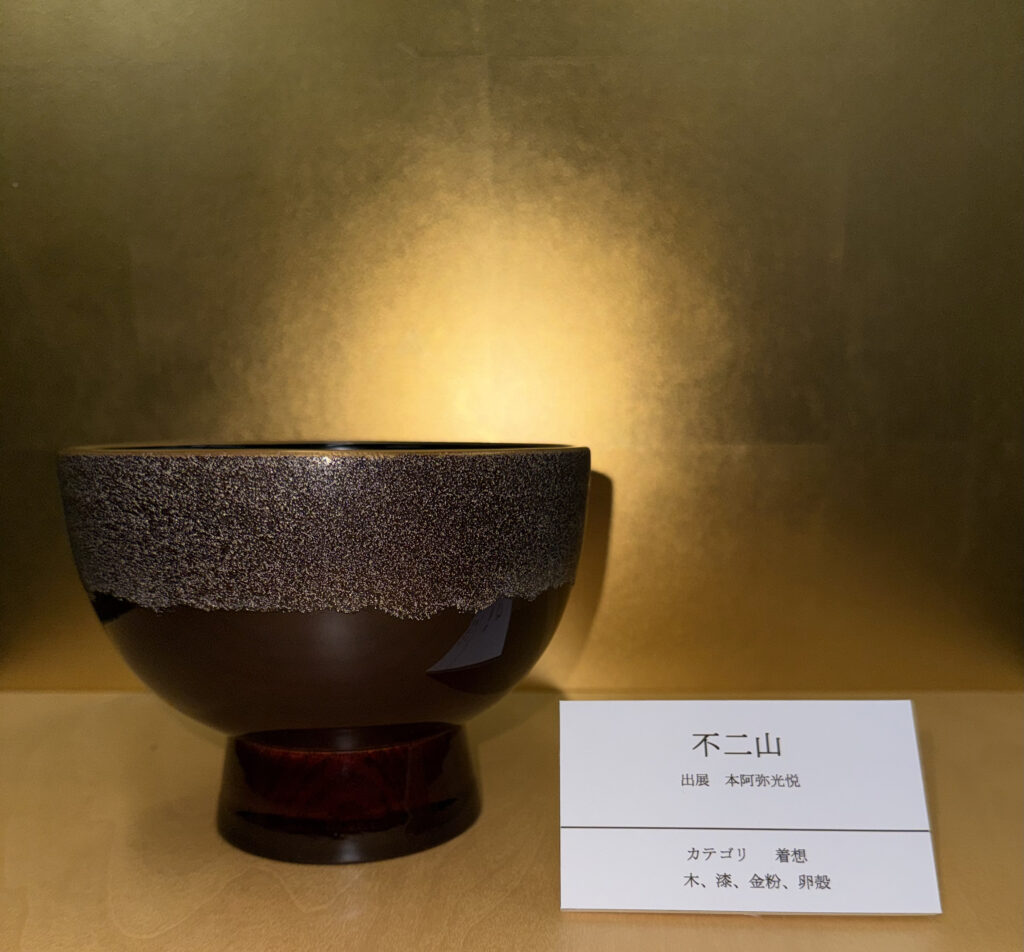 『不二山』は、サンリツ服部美術館蔵の本阿弥光悦作の「楽焼片身変茶碗・銘不二山」(国宝)を典拠としています。黒の楽茶碗の口部分に白い釉薬を施し、不二山の雪渓と見立てたもので、光悦の文化人としての資質の高さをうかがわせる作品です。「着想」のカテゴリで制作しました。雪渓部分には卵殻を蒔き研ぎ出しました。本阿弥光悦は、江戸時代初期に琳派の始祖と捉えられる、琳派の代表的な作家として知られています。