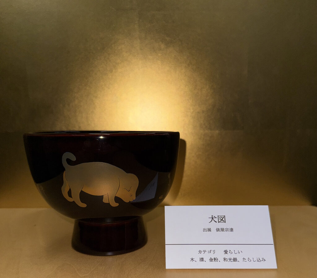 『かたつむり』は、千葉市美術館蔵の神坂雪佳の「百々世草(狗児)」の作品を典拠としています。仔犬がカタツムリをじっと見ているかわいらしい作品で「愛らしい」のカテゴリで制作しました。二匹の仔犬の表情に注意を払い、白漆をはじめとする色漆による表現を試みました。神坂雪佳は明治期から活躍した琳派の代表的な作家として知られています。