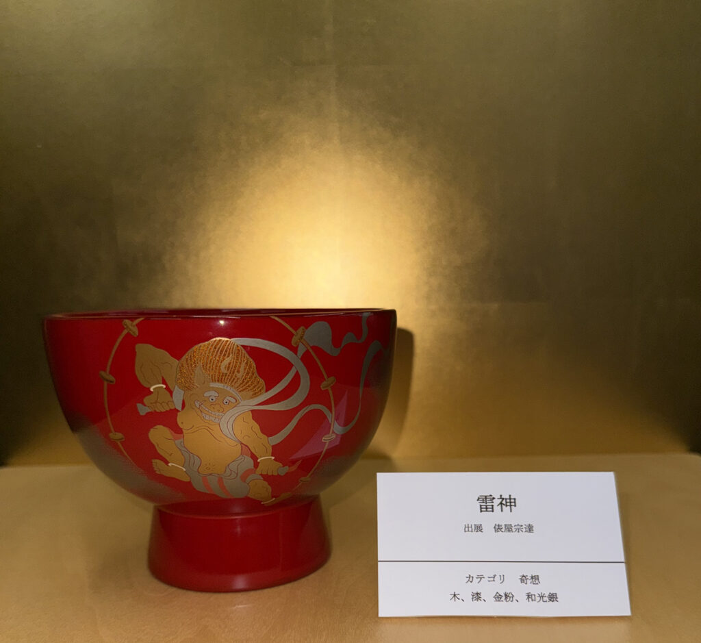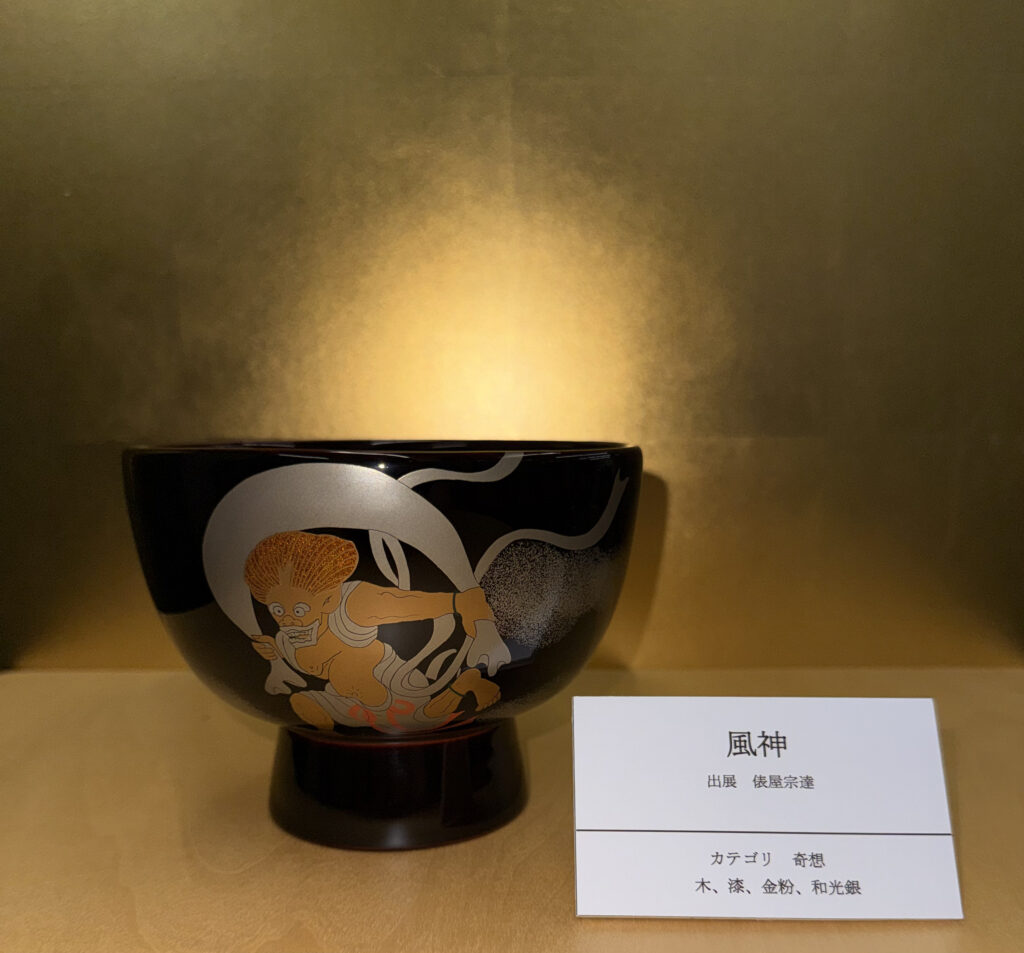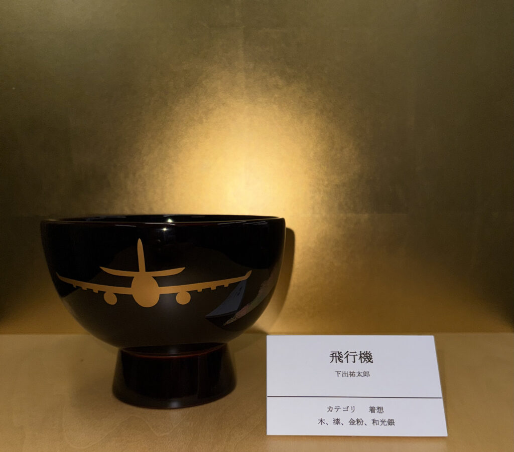 『飛行機』は、「着想」のカテゴリで制作しました。有名なものに建仁寺蔵の俵屋宗達筆「風神雷神図屏風」(国宝)やサンリツ服部美術館蔵の本阿弥光悦作の「楽焼片身変茶碗・銘不二山」(国宝)などがあります。昔の人の発想の斬新さに驚かされます。合鹿椀に描くモチーフがジェット機であっても、はるか及ばない気がします。金の飛行機雲に色漆を配し夢の飛行を続けます。