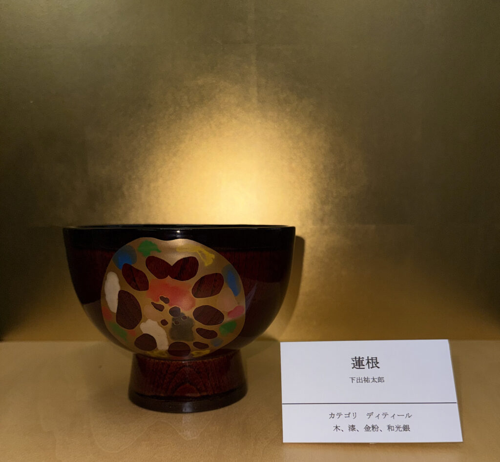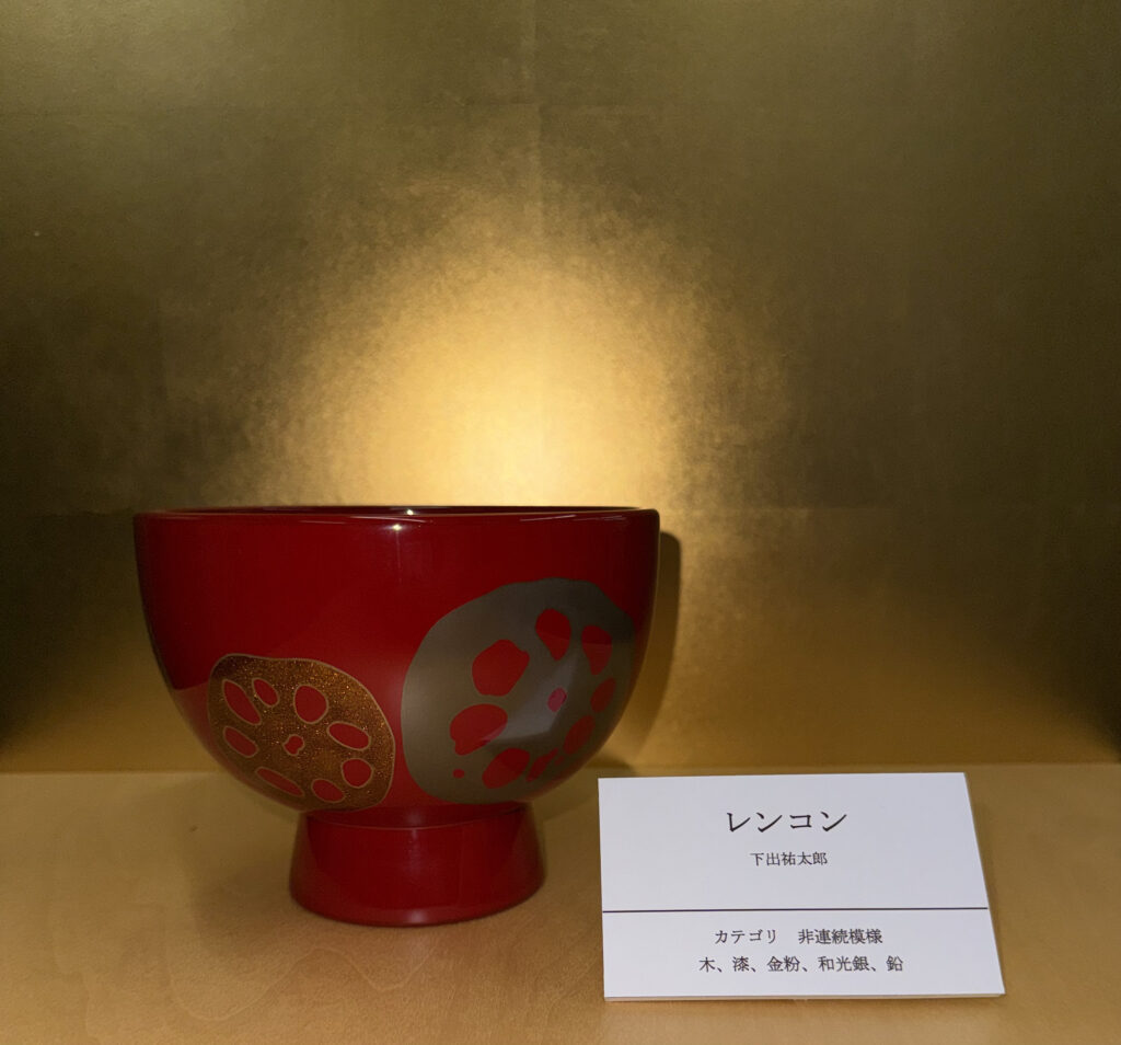 『蓮根』は、大阪市立美術館蔵の尾形光琳筆紙本金地着色一幅「燕子花図」の花に肉迫した作品を参考にしています。蓮根の輪切りの形状の面白さ。ひとつとして同じものがないのは自然が生み出したいたずらのようにも見えます。「ディティール」のカテゴリで制作しました。レンコンを金蒔絵として、色漆で彩を添えました。