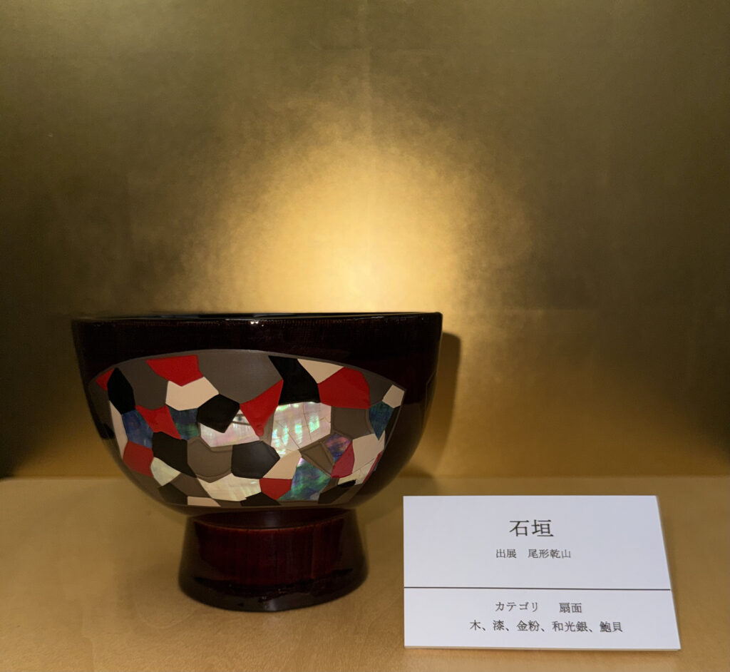 『石垣』は、京都国立博物館蔵の尾形乾山作「色絵石垣文角皿」のカラフルな作品を典拠としています。その石垣を、琳派の作品に見受けられる扇面のデザインとして配し、金やアワビ貝、鶉の卵殻で変化を持たせて「扇面」のカテゴリで制作しました。尾形乾山は尾形光琳の弟にあたり江戸中期に活躍した琳派の代表的な作家として知られています。