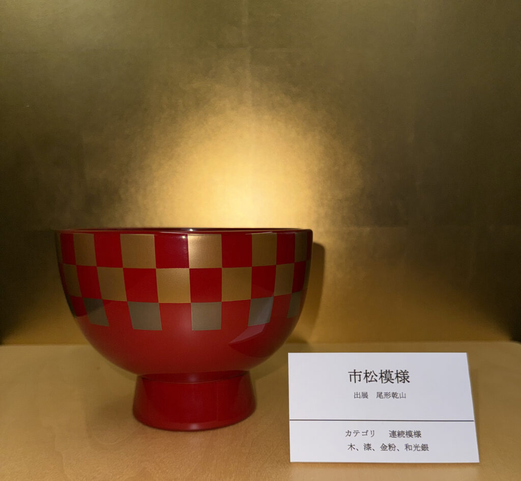 『市松模様』は、MIHO MUSEUM蔵、尾形乾山作「色絵阿蘭陀写市松文猪口」の作品を典拠としています。現代にも展開されるデザインの伝統的な側面を見るような作品で「連続模様」のカテゴリで制作しました。金と銀のみの配色です。尾形乾山は尾形光琳の弟で陶芸家であり、江戸時代中期に京都を中心に活躍した琳派の代表的な作家です。