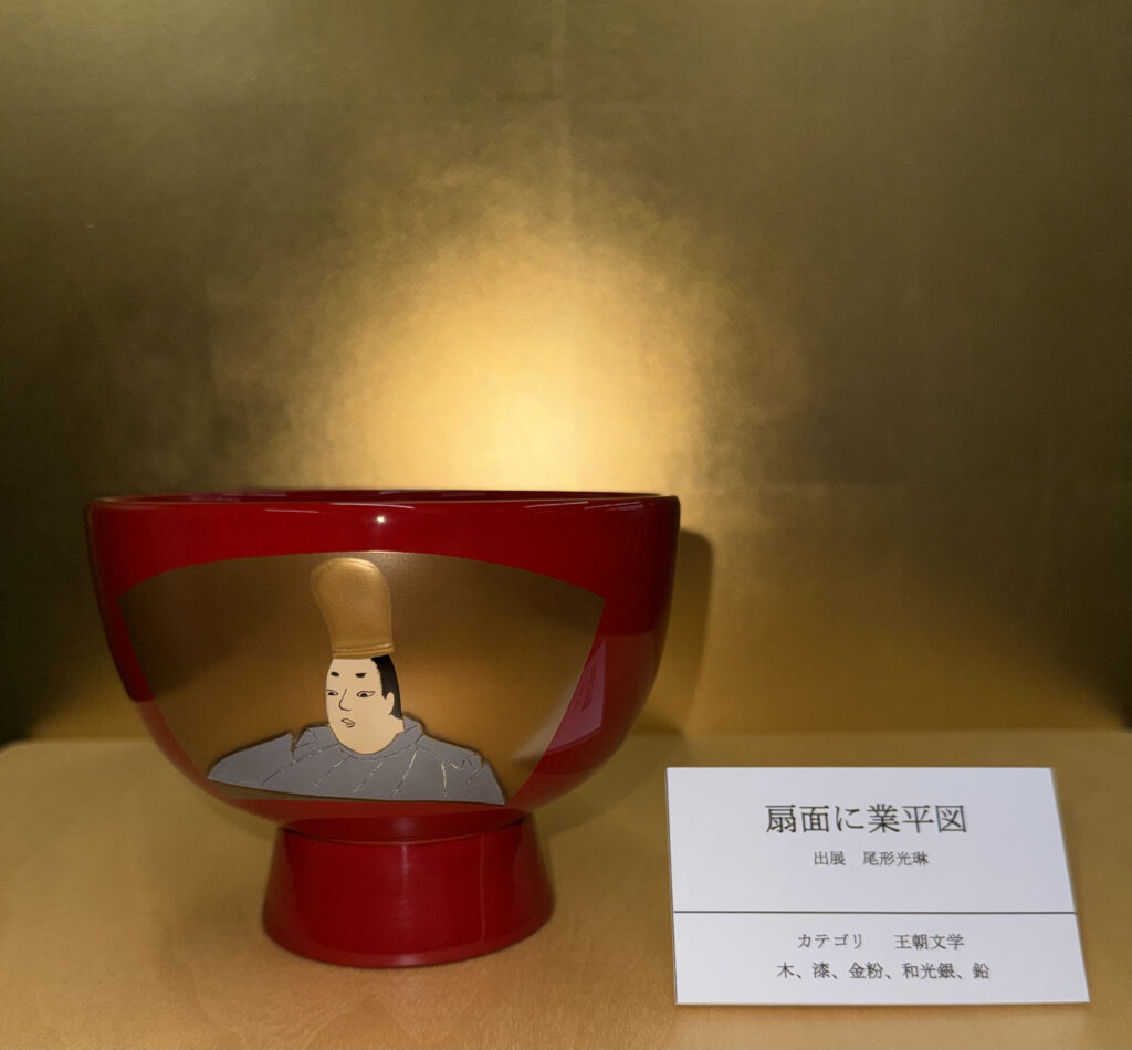 『扇面に業平図』は、根津美術館蔵の尾形光琳作「扇面業平蒔絵硯箱」の作品を典拠としています。伊勢物語の主人公とされる在原業平を扇面の中に描いた作品で、後に柴田是真が模写し同仕様で制作しています。「王朝文学」のカテゴリで制作しました。尾形光琳は琳派の代表的な作家として知られています。