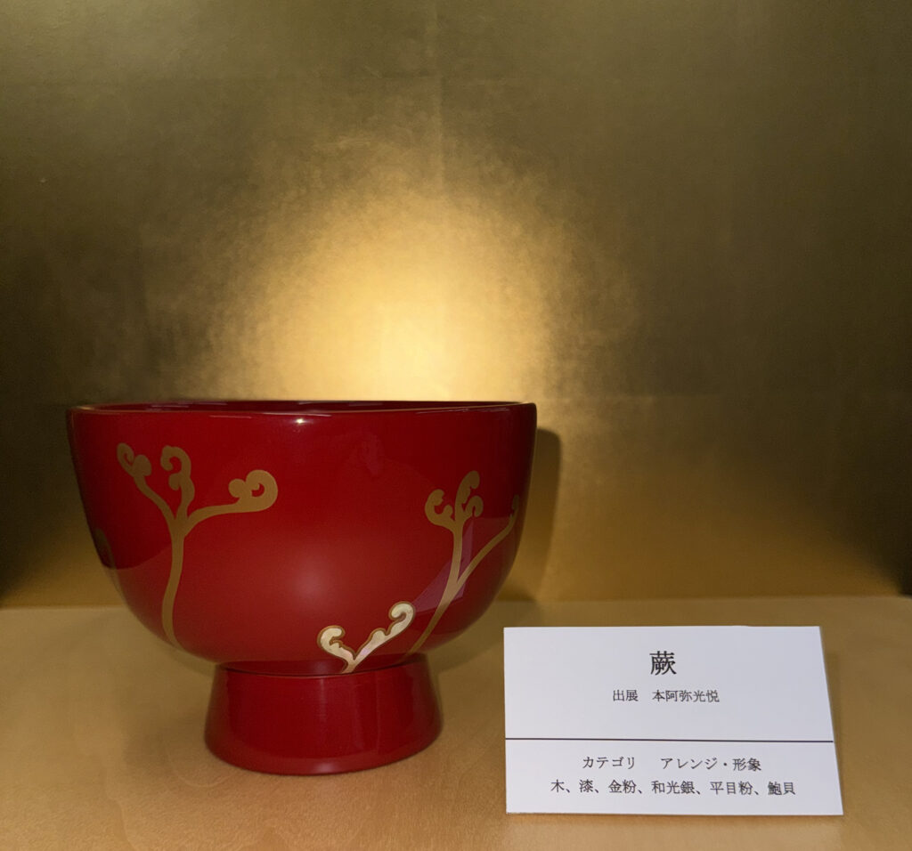 『蕨』は、MOA美術館蔵の本阿弥光悦作とされる「樵夫蒔絵硯箱」(重文)を典拠としています。下足板に蒔絵で描かれた蕨が、春を待ちかねたように奔放ともいえる伸びやかさで描かれており、形の捉え方も面白く独特のシルエットで捉えた「アレンジ・形象」のカテゴリで制作しました。本阿弥光悦は、江戸時代初期に琳派の始祖と捉えられる、琳派の代表的な作家として知られています。
