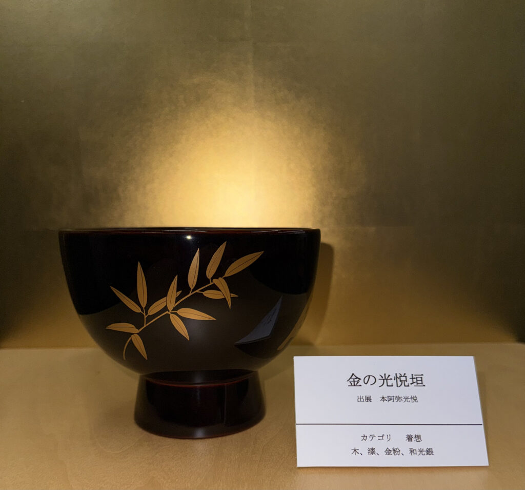 『金の光悦垣』は、京都洛北鷹峯にある光悦寺の庭に作られた竹垣を典拠としています。光悦が考案したとされる割り竹を粗い菱形に組み、上に割り竹をのせゆるやかなカーブを描く竹垣は、庭に雅味をもたらせた独特の発想です。「着想」のカテゴリで制作しました。本阿弥光悦は、江戸時代初期に琳派の始祖と捉えられる、琳派の代表的な作家として知られています。